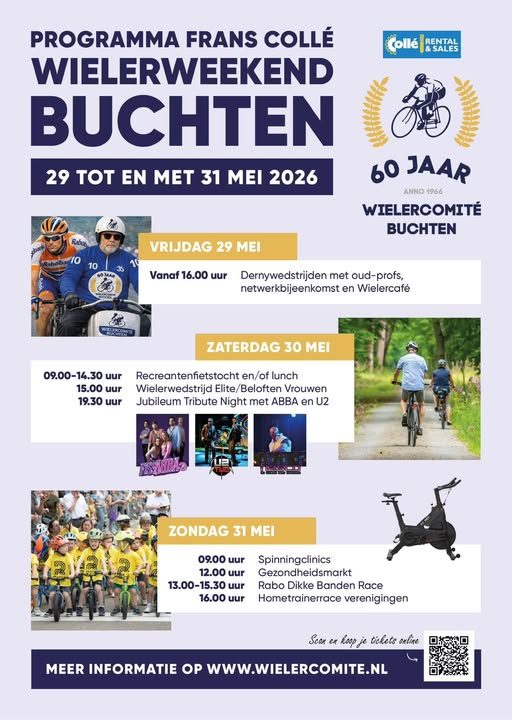 Van vrijdag 29 tot en met zondag 31 mei vindt het jaarlijkse wielerweekend plaats. Deze editie heeft vanwege het diamanten jubileum een speciaal randje. We willen onder meer met een gevarieerd en toegankelijk programma iets terugdoen voor iedereen die het Wielercomité Buchten een warm hart toedraagt. Hiermee onderstrepen we het belang van onze speciale band met de inwoners en ondernemers van wielerdorp Buchten en omliggende regio. Het programma ziet er als volgt uit.